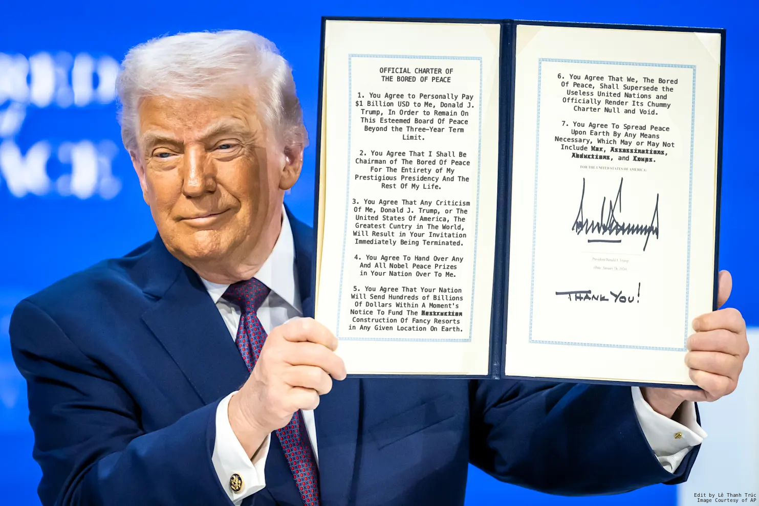 From what we see, the Charter of The Bored Of Peace has some rather interesting clauses. We present a quick rundown of each article of the Charter, alongside hot scoops from The Donald himself.
